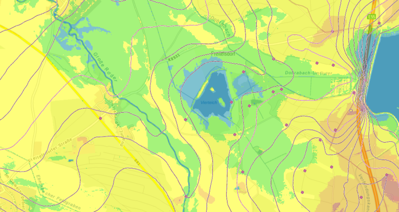 Im Landwirtschafts- und Umweltinformationssystem des LfULG sind für die drei Grundwasser-Stichtagsmessungen 2016, 2021 und 2022 jeweils Karten mit den Hydroisohypsen, der Grundwasseroberfläche und den zu ihrer Konstruktion verwendeten Stützstellen sowie zum Grundwasserflurabstand verfügbar. Die einzelnen Kartenlayer sind in der interaktiven Anwendung »iDA« beliebig zu- und abschaltbar und beispielsweise mit Grundwassermessstellen und aktuellen Messwerten kombinierbar. Genauere Informationen zu den jeweiligen Kartenlayern enthalten die Metadatenbeschreibungen.