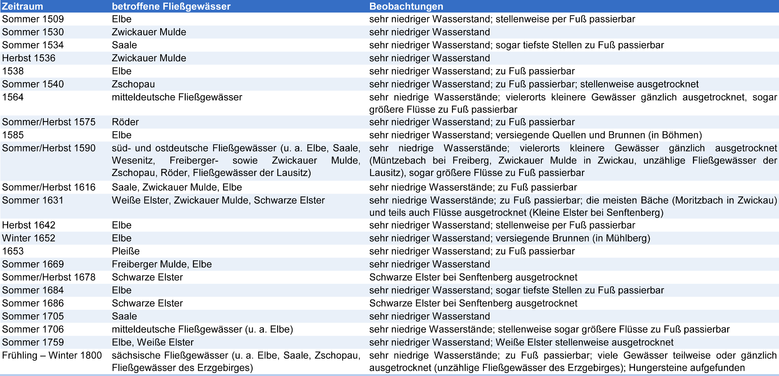 In den vergangenen Jahrhunderten traten wiederholt außergewöhnliche Trockenzeiten auf, die mit starkem Wassermangel einhergingen. Dies belegen zahlreiche heute noch vorhandene Berichte, welche bis in das 16. Jahrhundert zurückreichen. Im Flussgebiet der Elbe kann dabei auf eine umfassende Beobachtungsreihe seit Einführung der regelmäßigen amtlichen Wasserstandsmessung im Jahr 1806 zurückgegriffen werden.