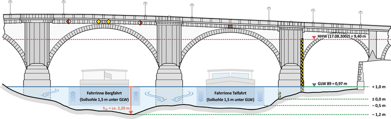 Der gemessene Wasserstand kann somit höher oder auch niedriger als die vorhandene Wassertiefe sein. Große Differenzen treten vor allem an ausgebauten Wasserstraßen auf, da hier die Wassertiefe in der Fahrrinne häufig deutlich größer als der gemessene Wasserstand ist. Auf den Pegel Dresden bezogen bedeutet dies, dass sich der Elbwasserspiegel bei 1,0 m Wasserstand ca. 2,2 m über dem tiefsten Punkt der Sohle befindet. Somit übertrifft die vertikale Ausdehnung des durchströmten Querschnitts an dieser Stelle auch bei mittleren Niedrigwasserständen um 70 cm immer noch die durchschnittliche Körpergröße eines Erwachsenen.